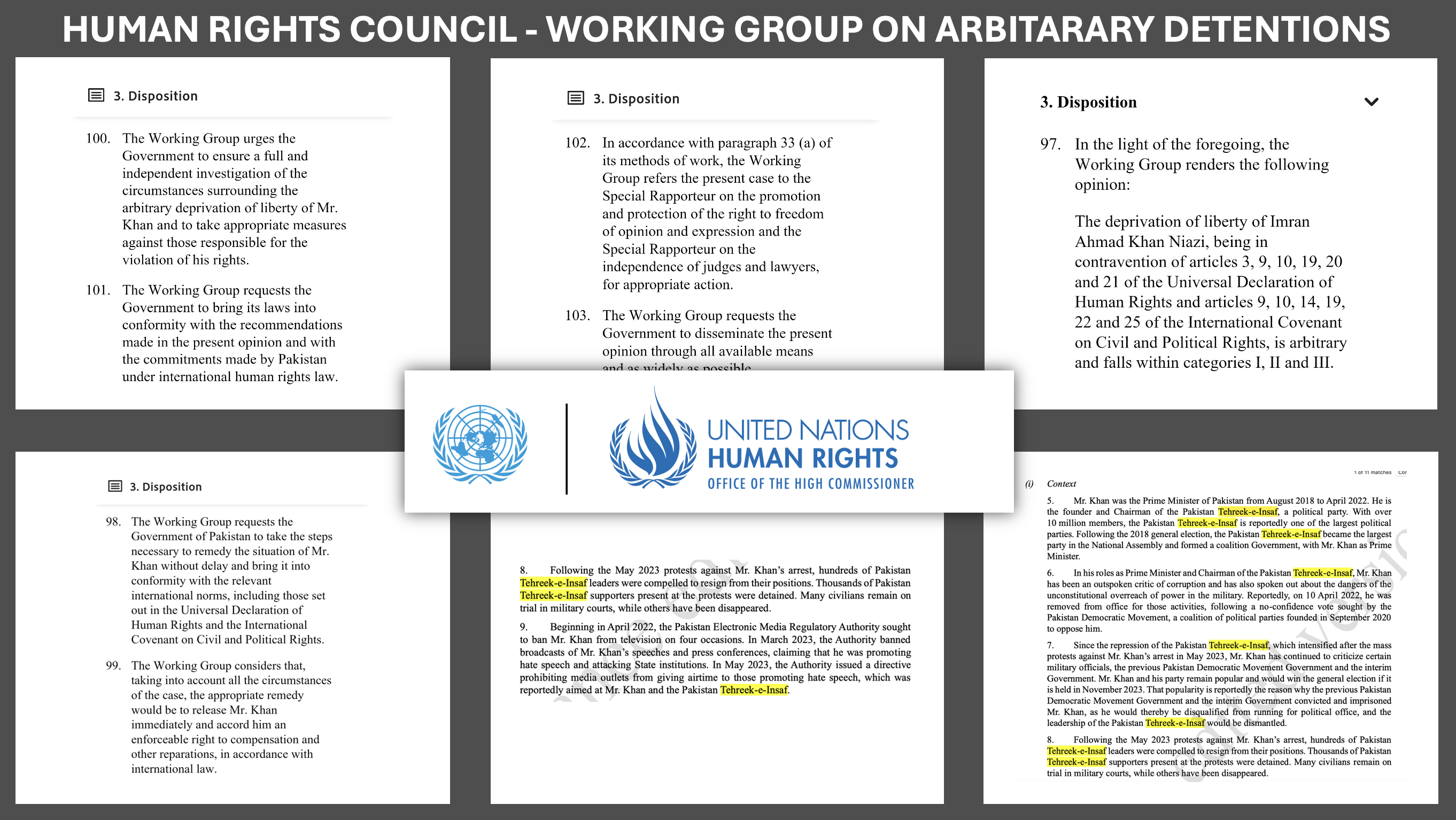 The people of Pakistan have been raising their voices and reaching out to international organizations, highlighting the human rights violations in Pakistan and demanding the immediate release of former Prime Minister Imran Khan and other unlawfully incarcerated political prisoners. On Monday, July 1, 2024, the United Nations Working Group on Arbitrary Detention issued an opinion on Imran Khan’s unlawful incarceration stating that Former Pakistani Prime Minister Imran Khan's detention is arbitrary and in violation of international law, adding that Imran Khan should be released immediately.