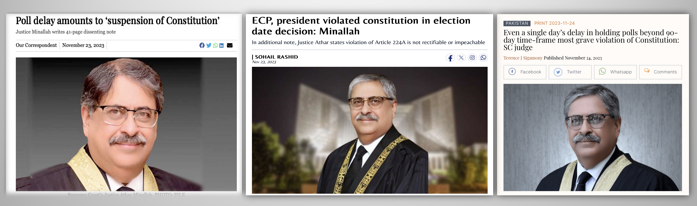 In November 2023, three-member bench of the apex court comprising Chief Justice of Pakistan Qazi Faez Isa, Justice Aminuddin Khan and Justice Minallah heard a set of petitions calling for holding elections within 90 days after the dissolution of the National Assembly and the provincial legislatures. Justice Athar made the following remarks in his additional note in a matter related to the case of election date.