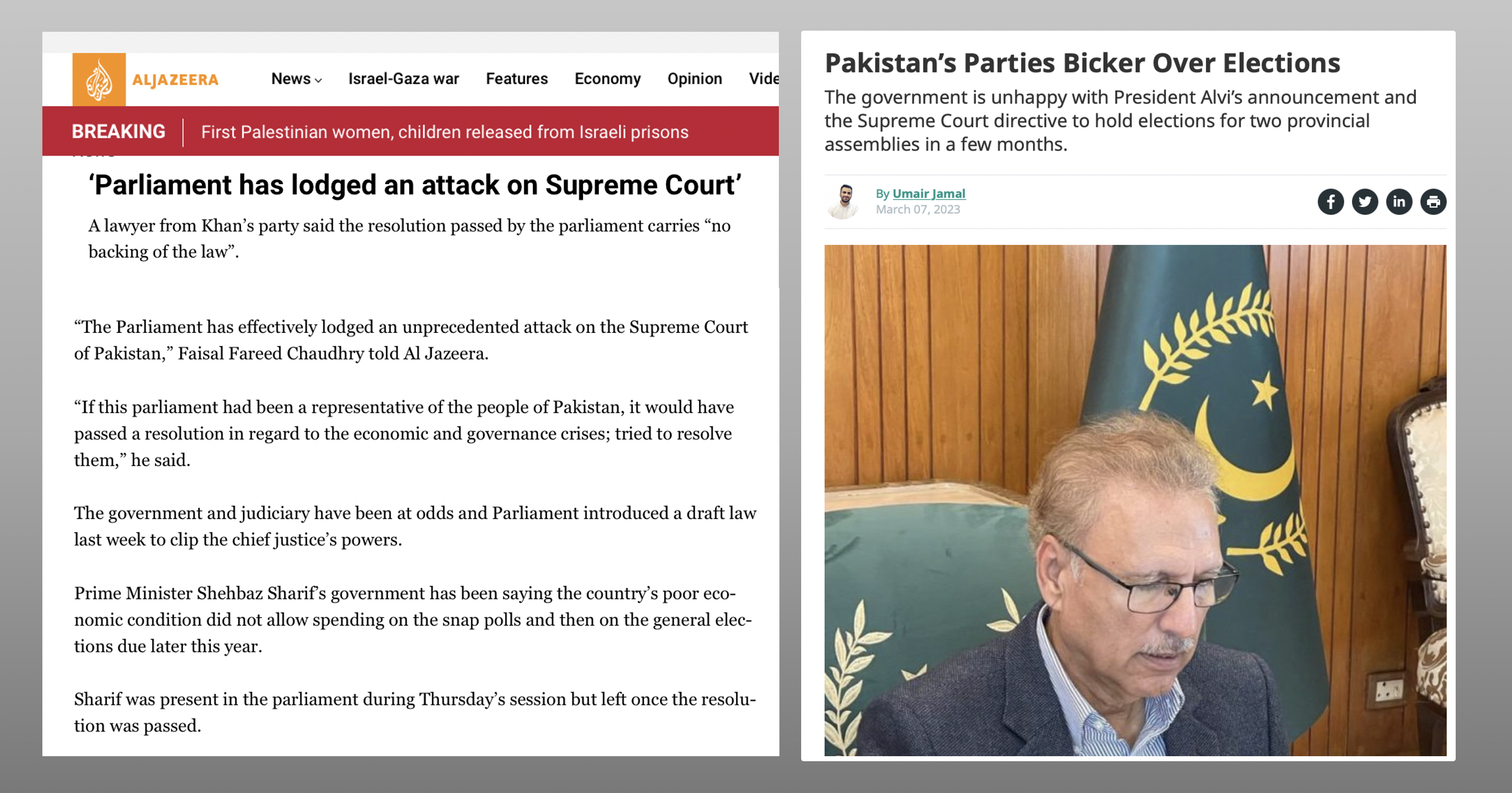 On Supreme Court’s order to hold elections within 90 days in Punjab and KPK, under the leadership of Shehbaz Sharif the parliament passed a motion rejecting Supreme Court order for polls to proceed. Addressing the National Assembly afterward, Shehbaz Sharif said the court's latest decision amounted to a "murder of justice." (April 2023)
