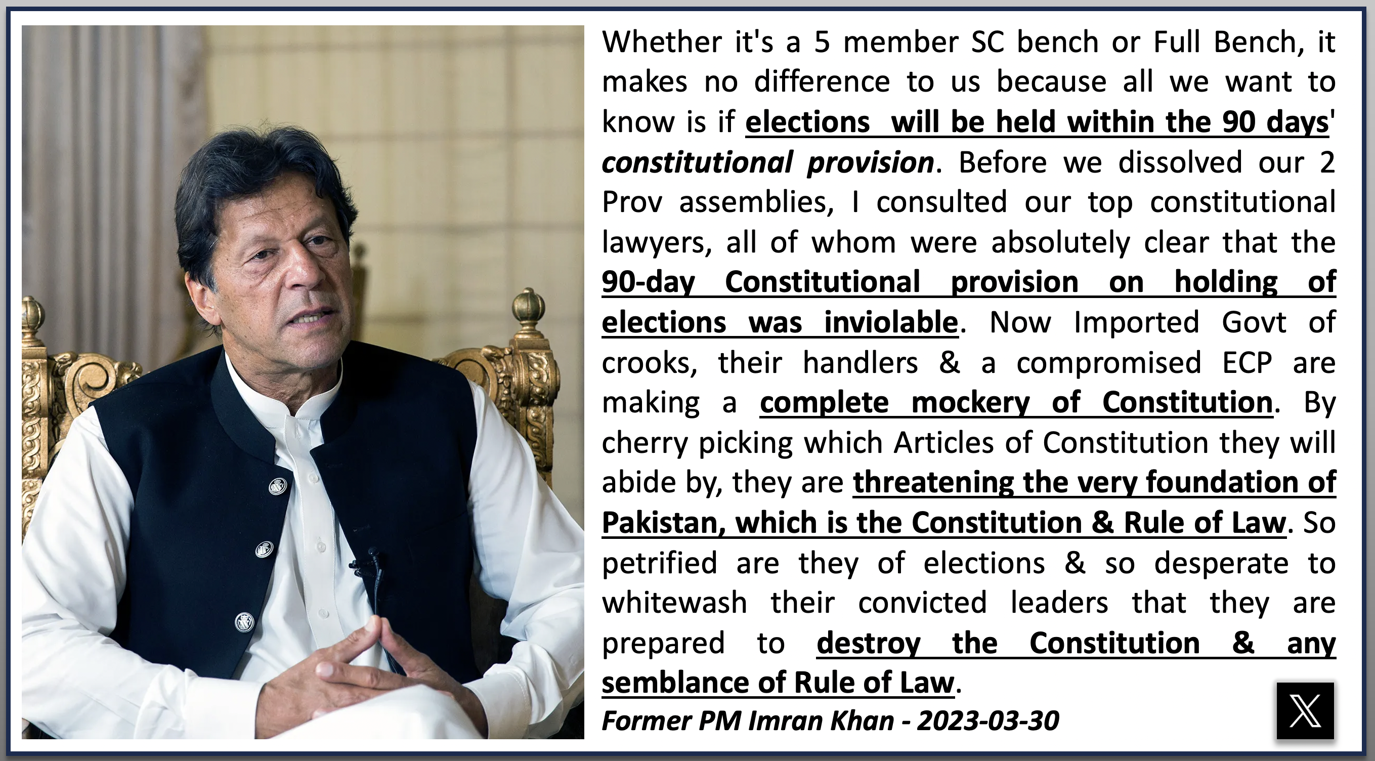 Imran Khan said, "Whether it's a 5 member SC bench or Full Bench, it makes no difference to us because all we want to know is if elections will be held within the 90 days' constitutional provision. Before we dissolved our 2 Prov assemblies, I consulted our top constitutional lawyers, all of whom were absolutely clear that the 90-day Constitutional provision on holding of elections was inviolable. Now Imported Govt of crooks, their handlers & a compromised ECP are making a complete mockery of Constitution. By cherry picking which Articles of Constitution they will abide by, they are threatening the very foundation of Pakistan, which is the Constitution & Rule of Law. So petrified are they of elections & so desperate to whitewash their convicted leaders that they are prepared to destroy the Constitution & any semblance of Rule of Law." (March 2023)