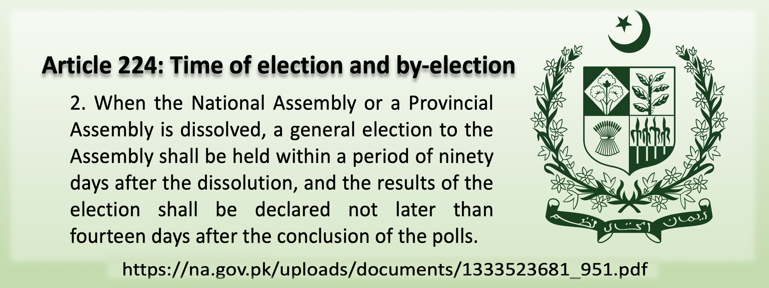 Article 224(2) of the Constitution of Pakistan, elections should be held within 90 days of the dissolution of an Assembly - whether National or Provincial - and the results should be declared in a maximum of 14 days after the conclusion of polls.