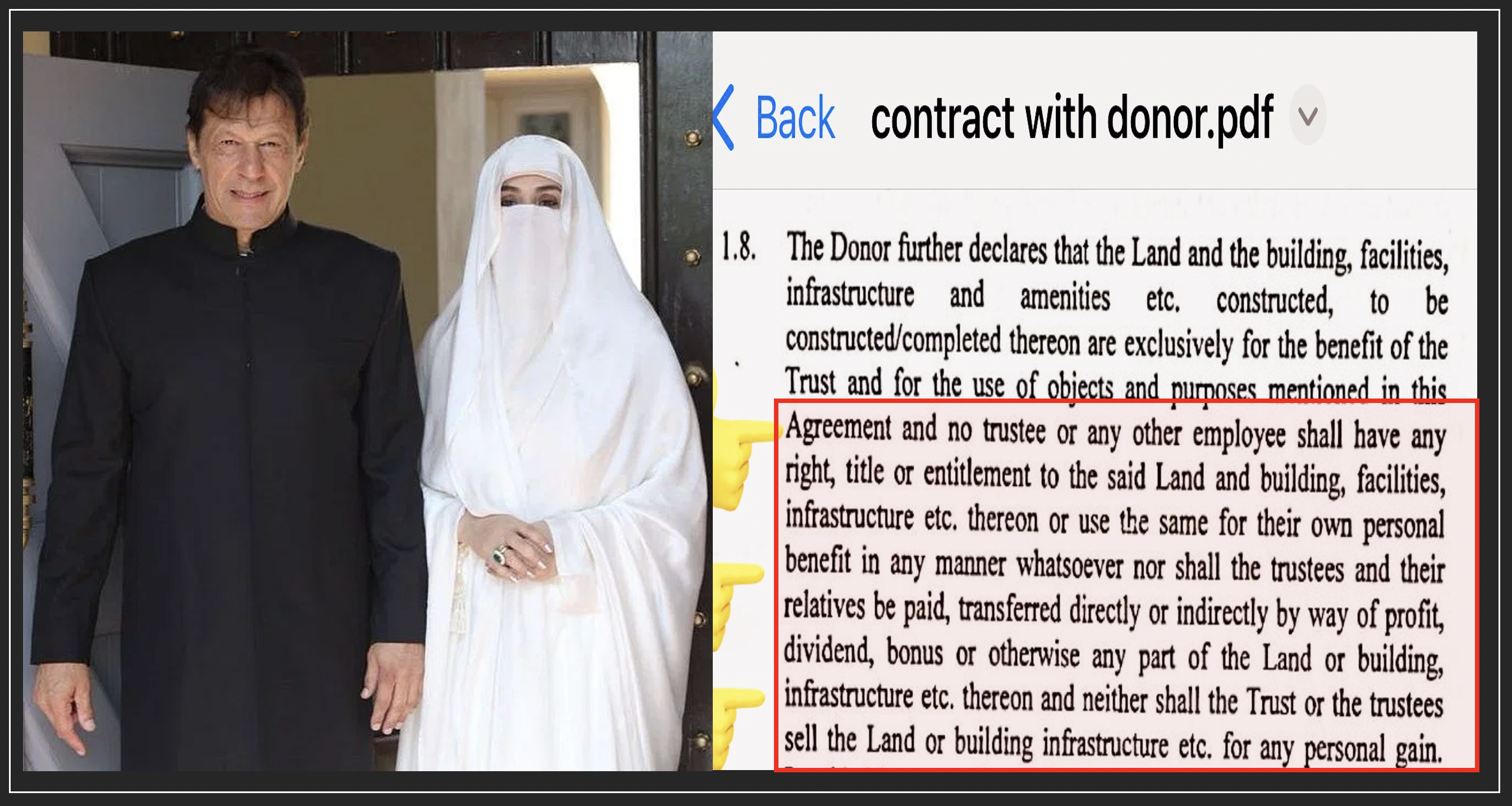 The monetary policy written in this Trust Deed has exactly the same status that is found in that of Imran Khan’s Shaukat Khanam Cancer Hospital, NAML University, and his previous (charitable) institutions. It has the same terms and conditions. This is no different from the rest of them. One of the most basic things that you all should know, the entire nation needs to know, is what is written is Clause 10.2 which is, "The trustee is not to receive any remuneration”. Meaning no kind of salary, benefit, or perk can be given to Imran Khan or to his wife from this project.