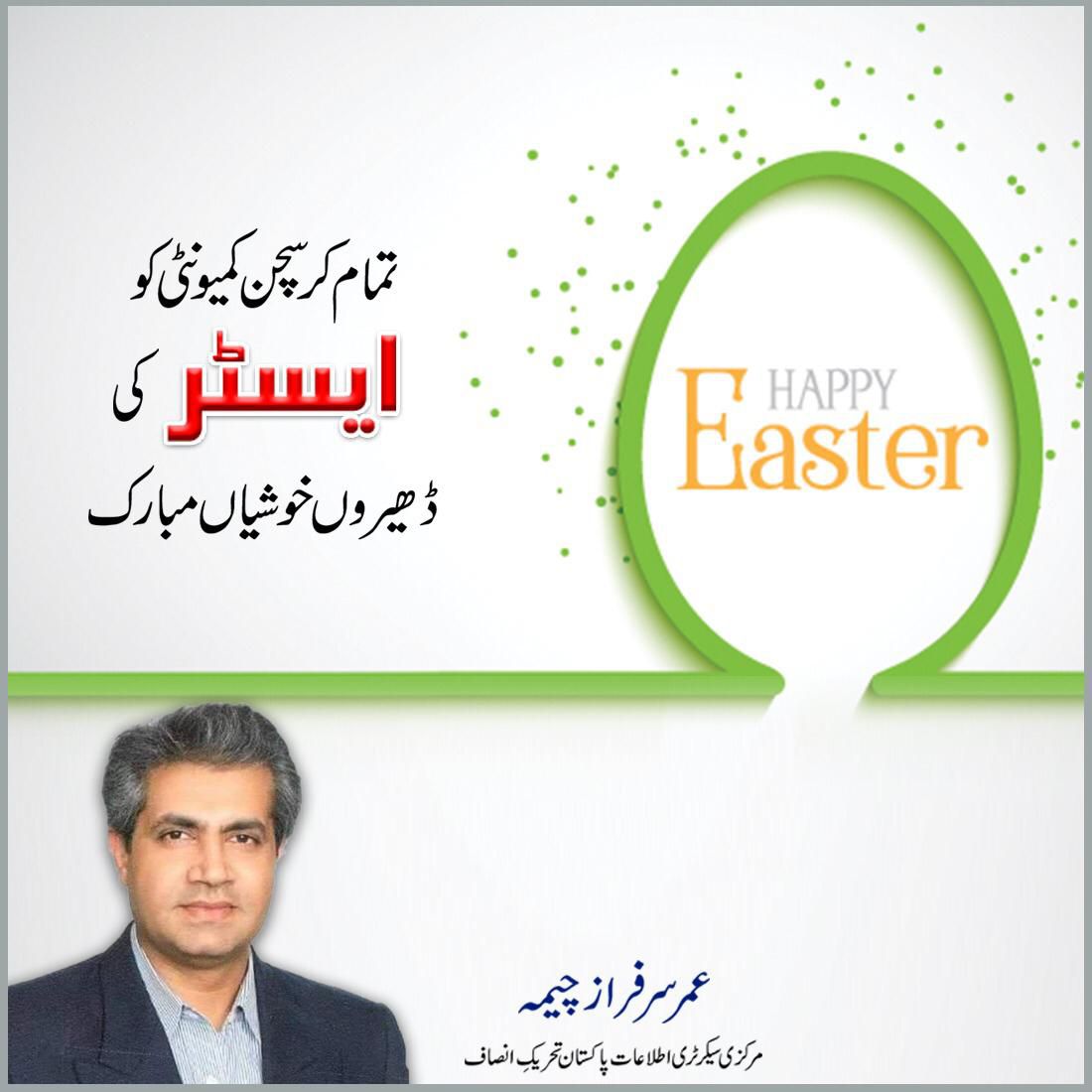 Secretary Information Pakistan Tehreek E Insaf Omer Cheema wishes the Christian community a happy Easter.