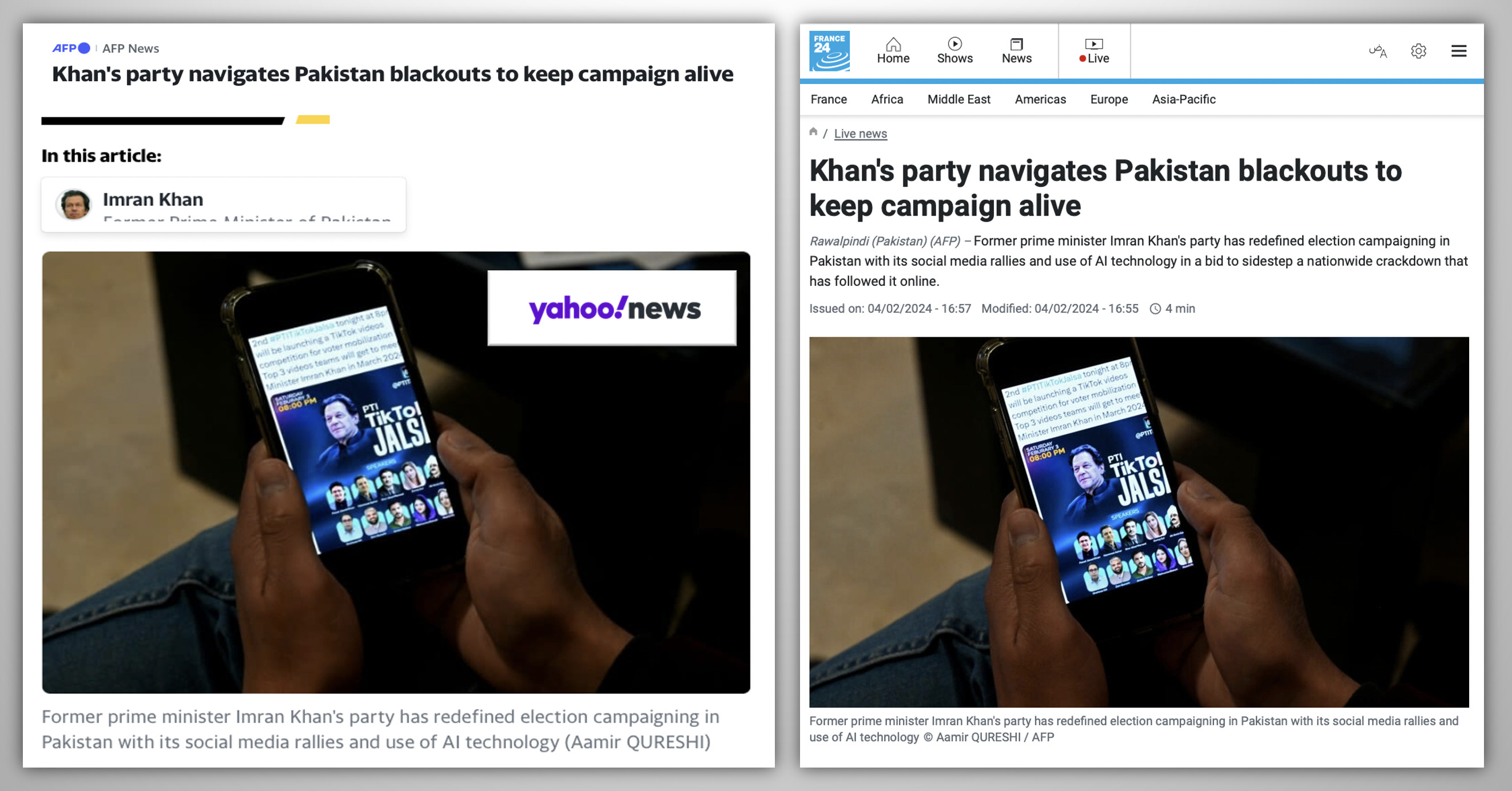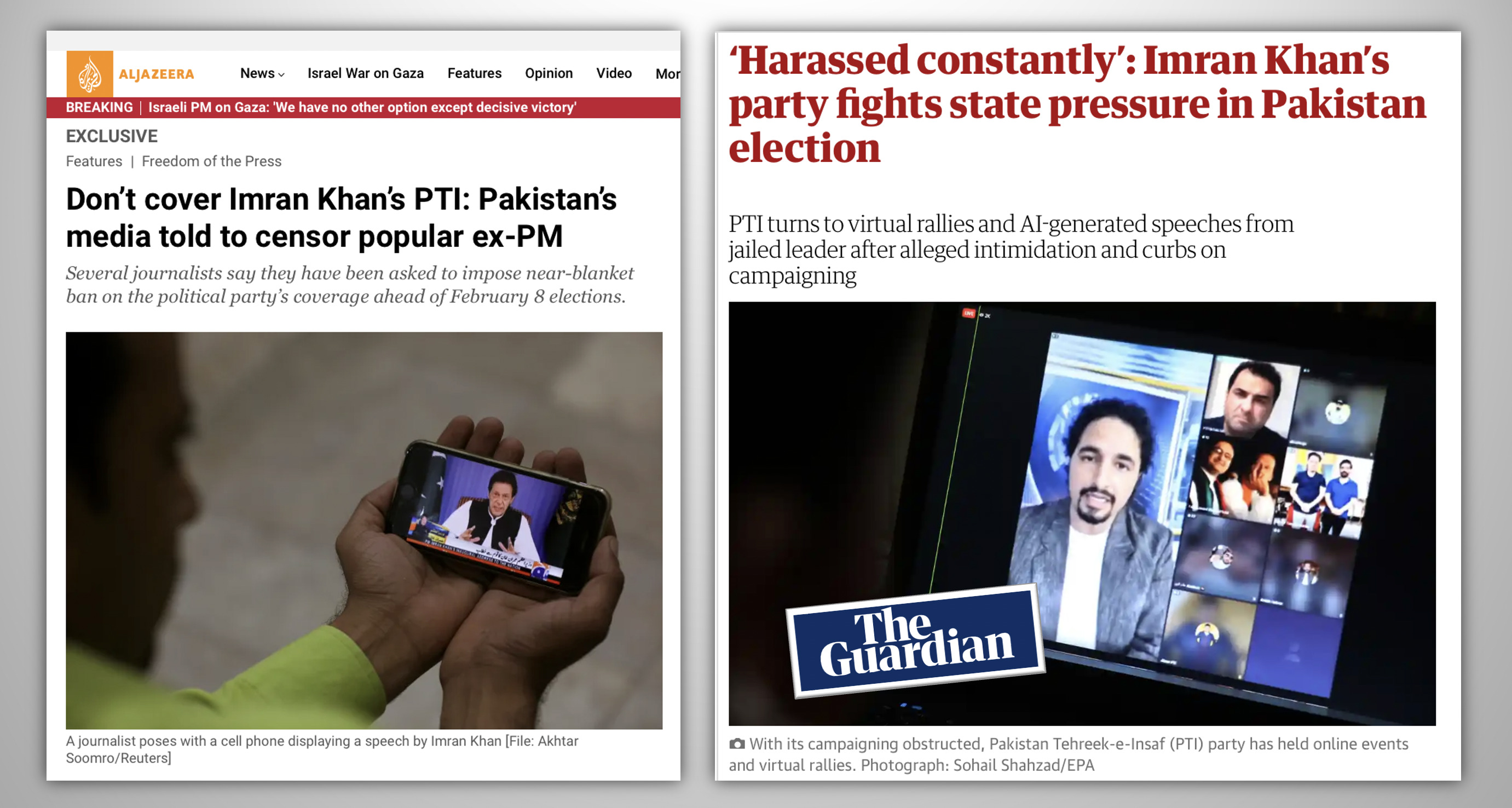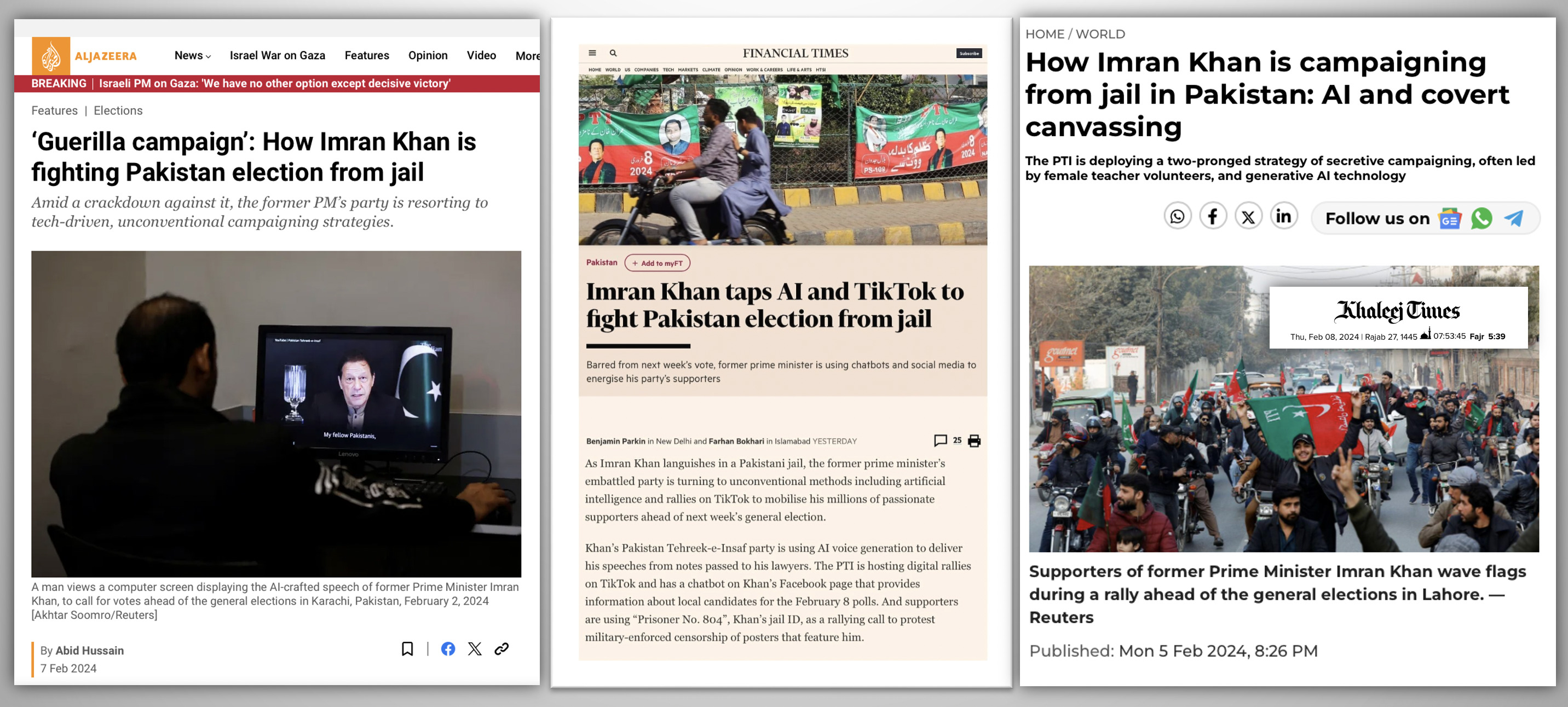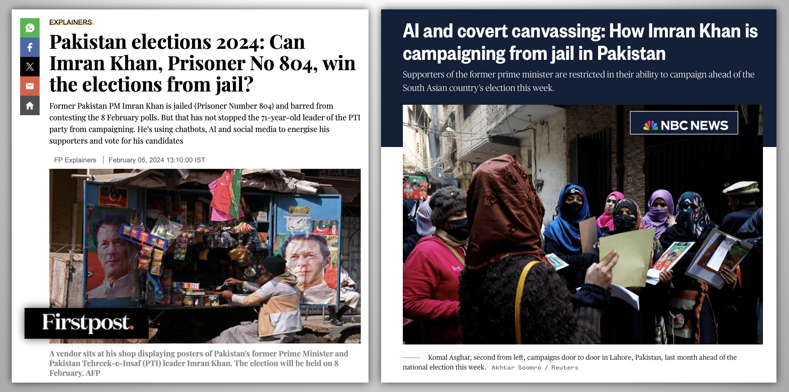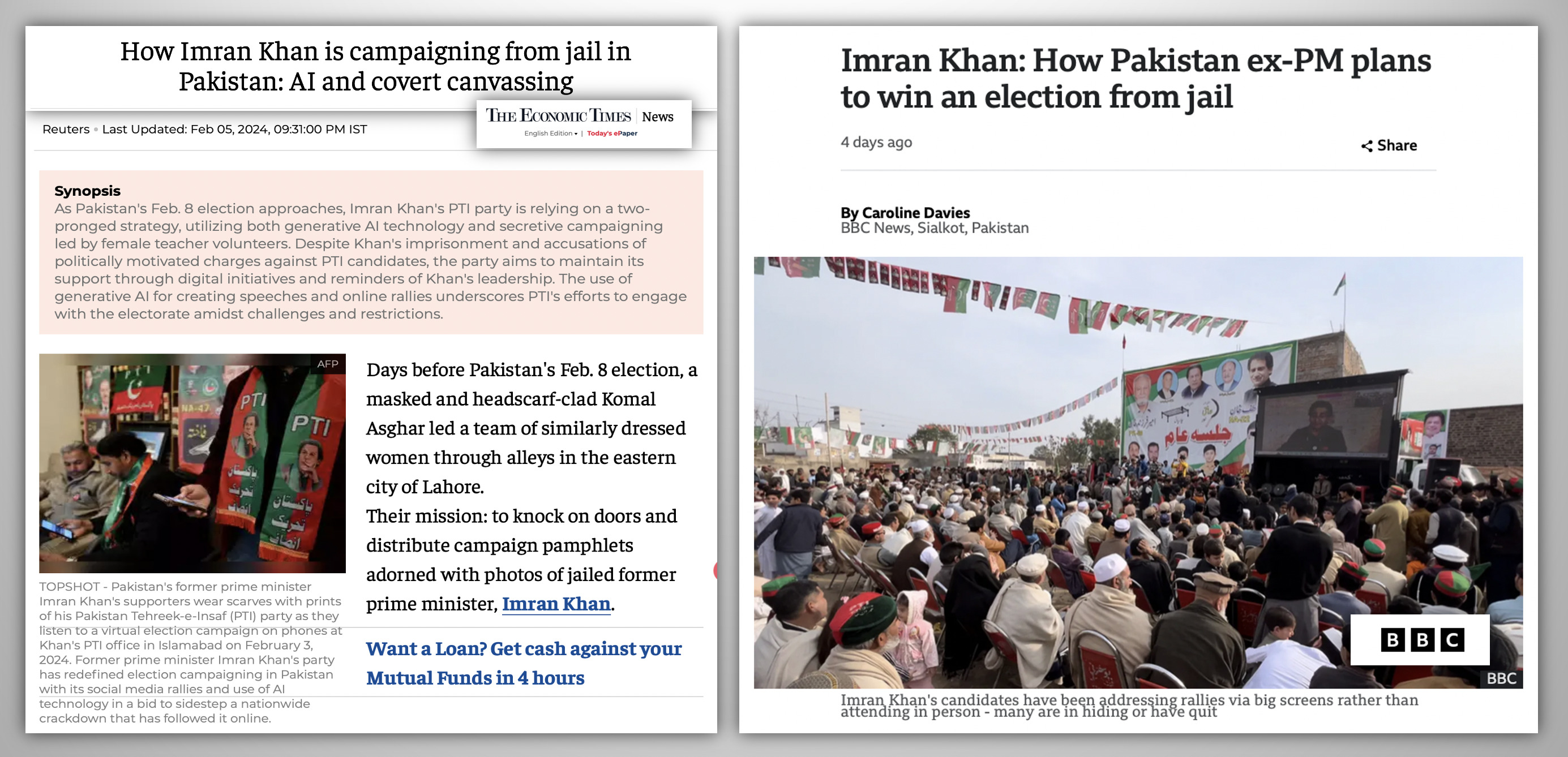 And recently, Reuters and NBC News also released a comprehensive piece, How Imran Khan is campaigning from jail in Pakistan: AI and covert canvassing, on how Pakistan Tehreek-e-Insaf (PTI) has adopted a multifaceted campaign approach amidst the challenges posed by a suppressive political environment, utilizing a combination of secretive campaigning led by female teacher volunteers and innovative generative AI technology, the party is navigating a complex electoral landscape.