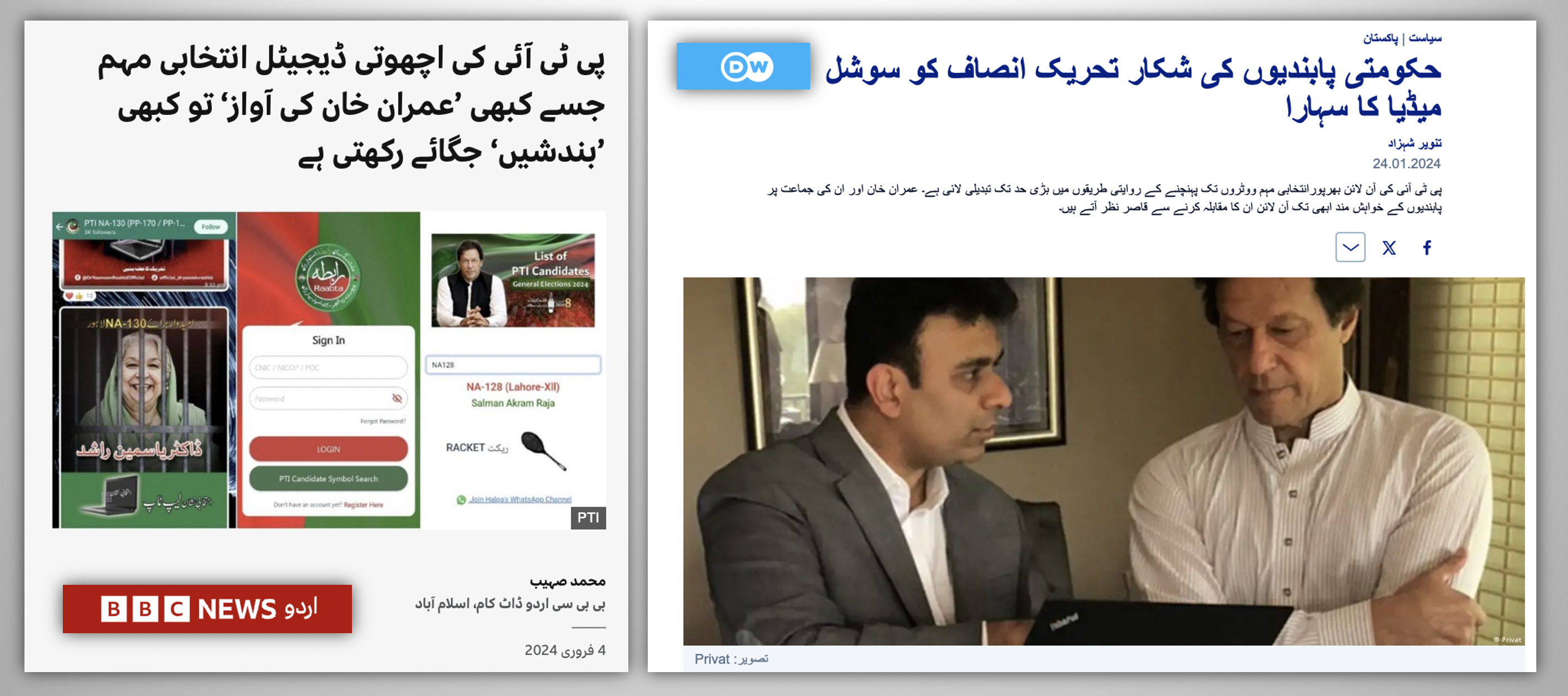 DW Urdu, in its article, Support of social media for Tehreek-e-Insaaf, which is suffering from government restrictions noted:
