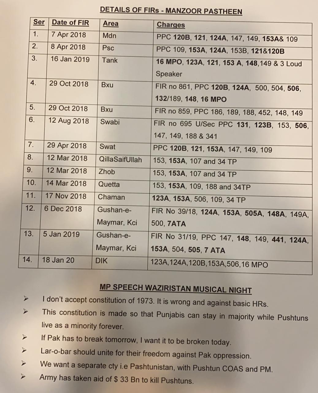 A total of 14 FIRs were registered against Manzoor Pashteen for anti-Pakistan speeches where he has been inciting violence.