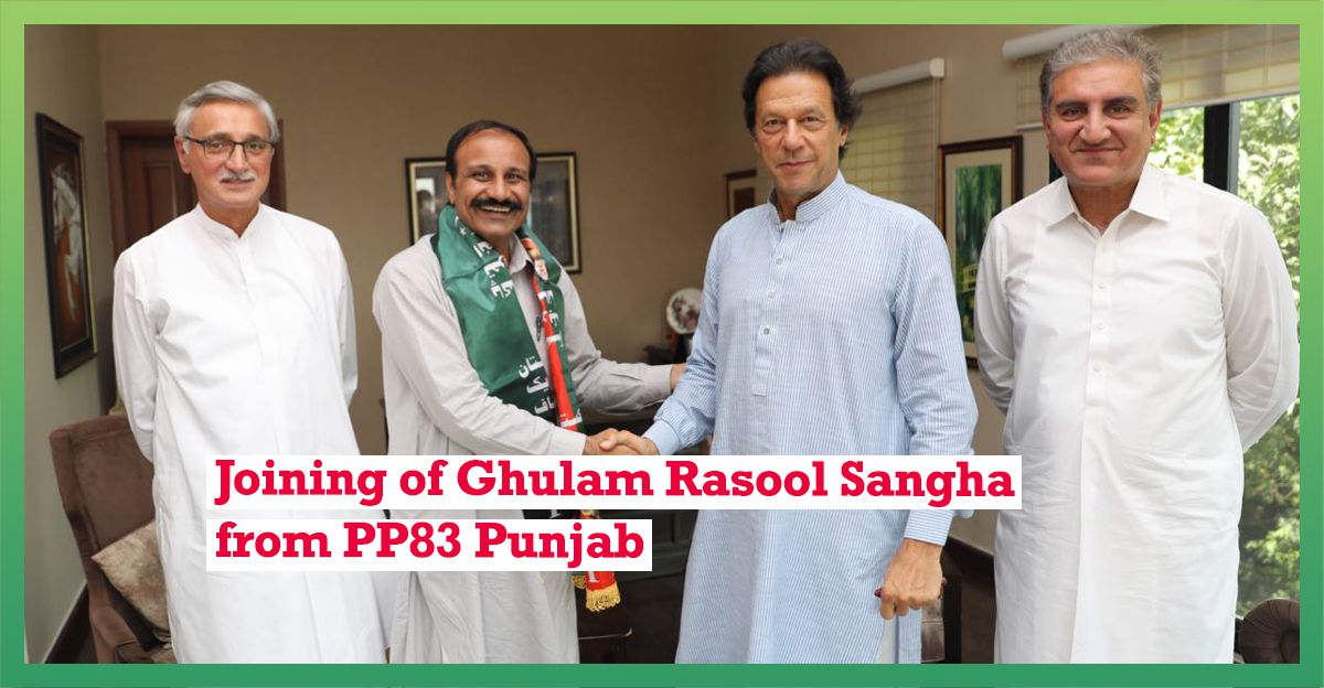 Mr Ghulam Rasool Sangha met the Chairman PTI Imran Khan at Bani Gala today and announced to join PTI - Senior leaders Jahangir Khan Tareen and Shah Mehmood Qureshi were also there.